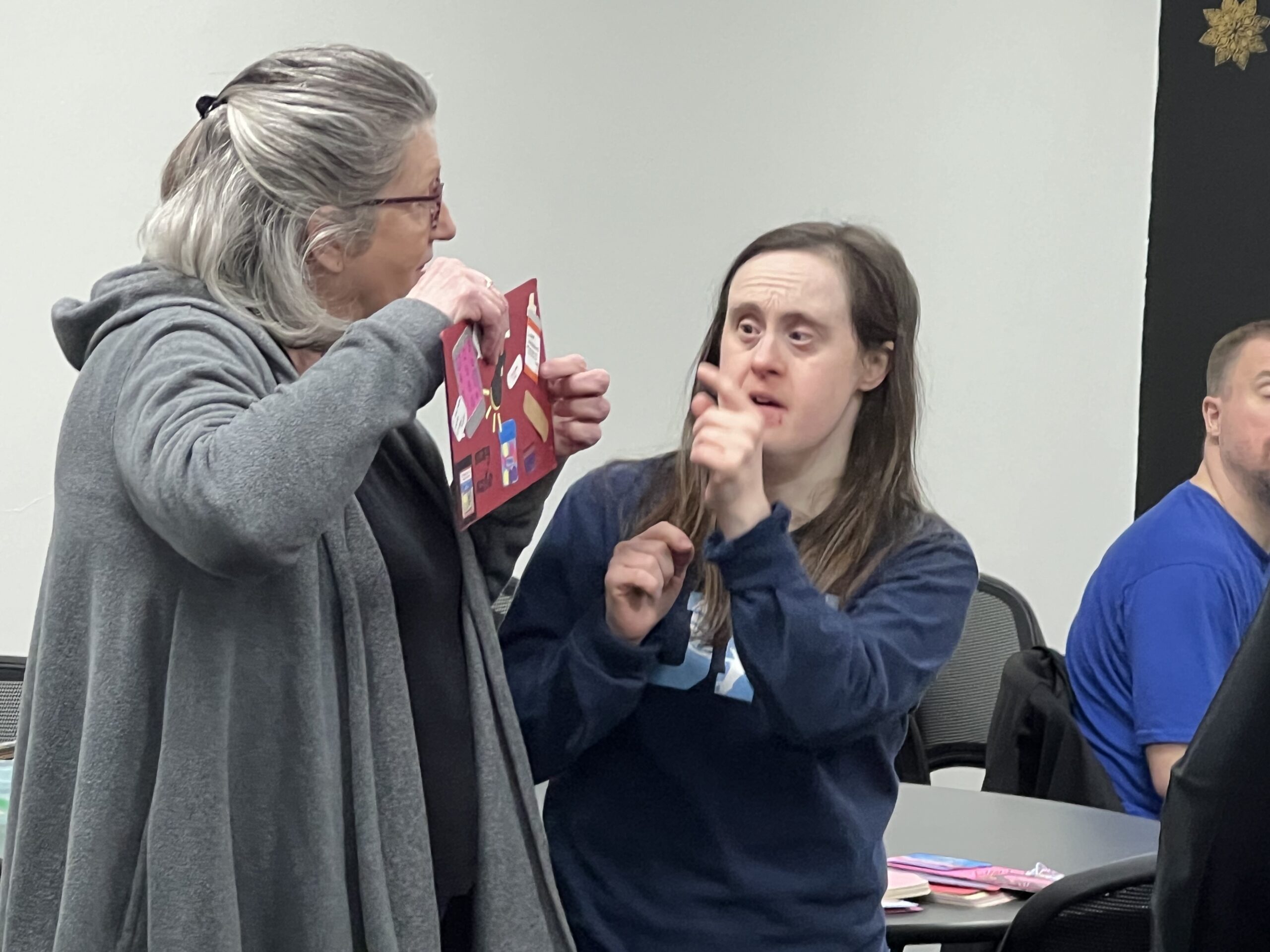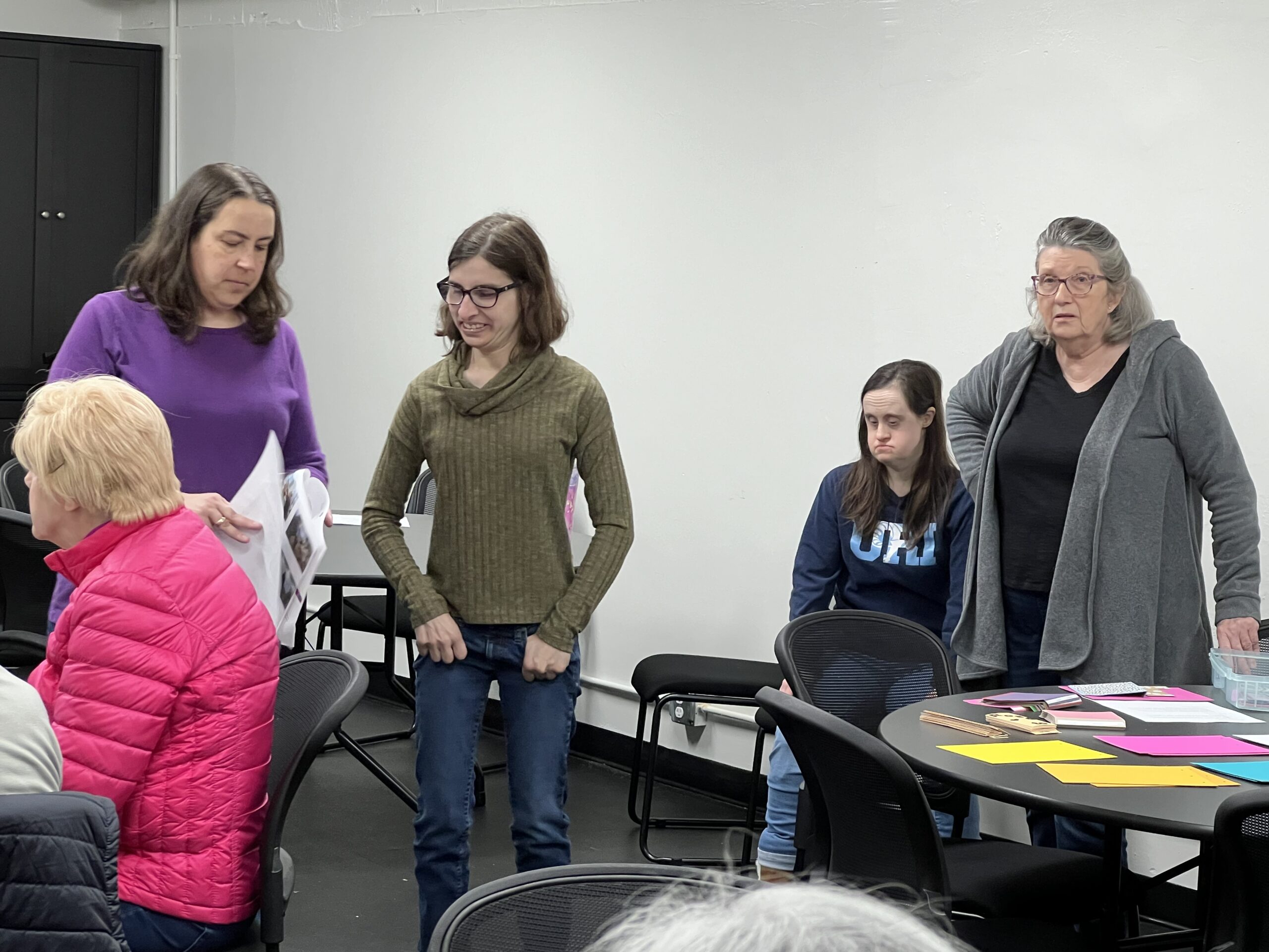 The almost ready-to-open Red White & Brew coffee café, located in Warwick, hosted twenty at the afternoon event in its conference room, along with their support staff and an ASL interpreter. Together, Katie and Claudia, with RICDC coordinators, Tanja Blicker-Ucran and Rachel Ferreira, guided the workshop, a fun-filled activity with many practical applications.