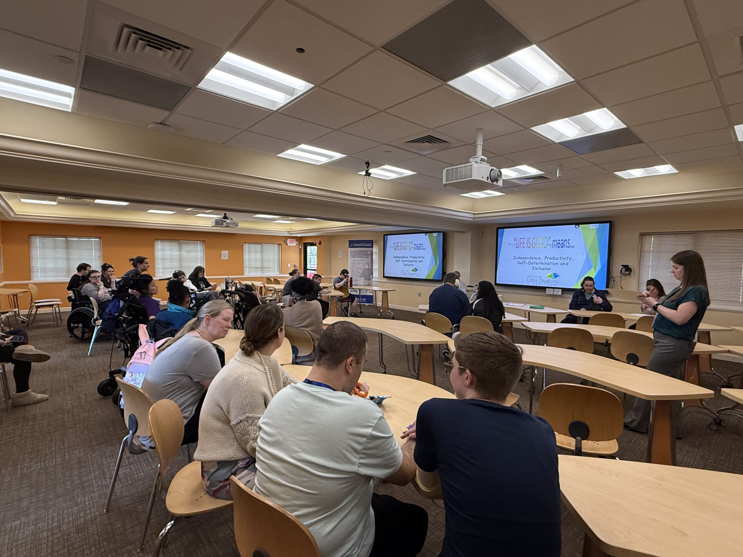 “Life Is Good” was presented by The RI Cross Disabilities Coalition team of Tanja Blicker-Ucran, Christina Battista and Kevin McHale, where the focus was on independence, productivity, self-determination and inclusion. Each member of the team took turns exploring one facet of the topic, sharing what it meant to them personally. Approximately twelve attendees plus the support staff agreed that these facets are what makes life good.